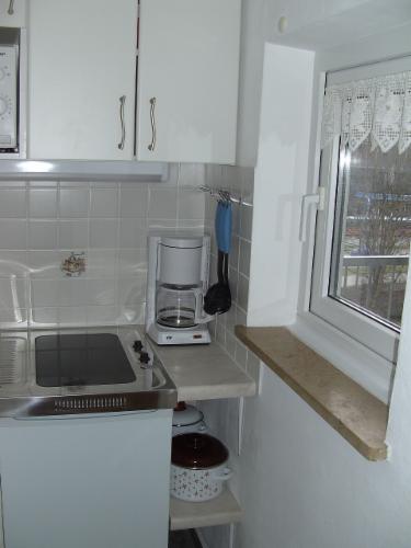 separate Küche mit Fenster, Granitfußboden, Wände im Bereich der Küchenzeile gefliest, voll ausgestattet mit
