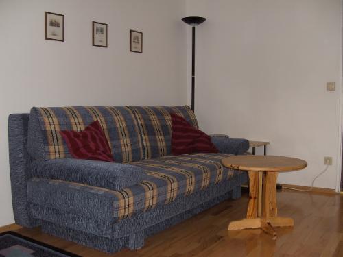 vollständig eingerichteter Wohnraum mit Sofa, das mit einem Handgriff in ein Doppelbett mit 1,6 m x 2,0 m oder ein Einzelbett mit 0,8 m x 2,0 m Liegefläche umgewandelt werden kann, mit Oberbett, Kopfkissen und Bettwäsche